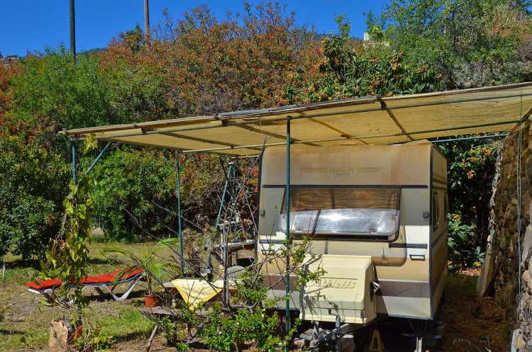 La caravana está bajo la protexión de un tejado y una marquesina con cocina al aire libre. Hay tumbonas, un hoguera y sitio para una tienda de acampada.